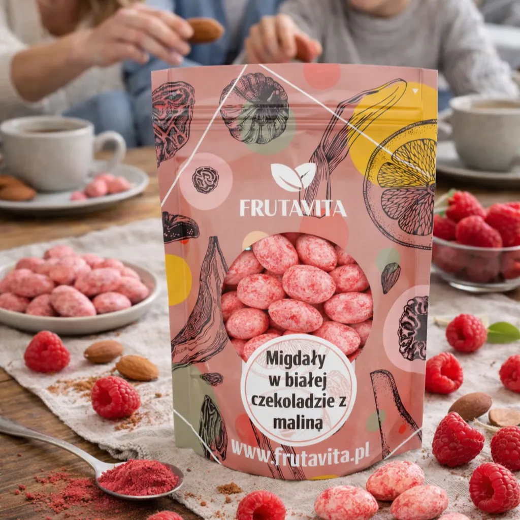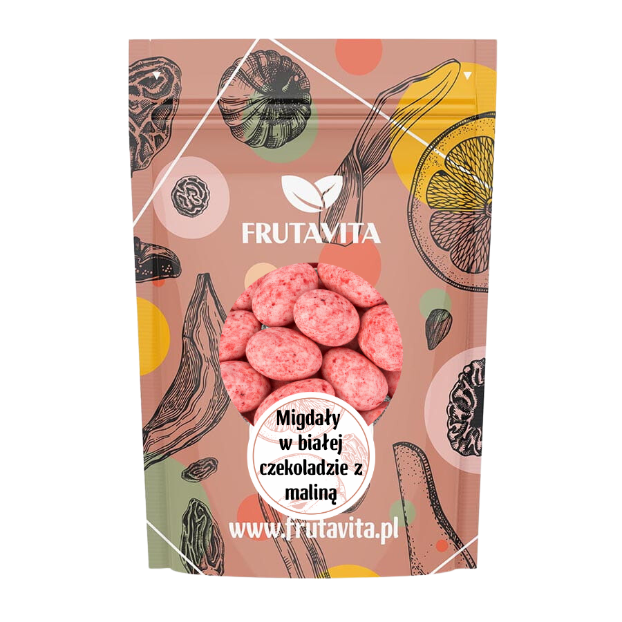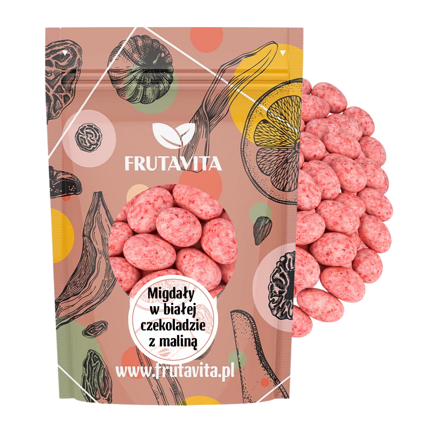 Chrupiące migdały w kremowej białej czekoladzie. Dodatek malin liofilizowanych nadaje naturalną owocową nutę. Harmonijne połączenie słodyczy i lekko kwaskowego smaku. Idealne jako przekąska, do deserów i na prezent.
