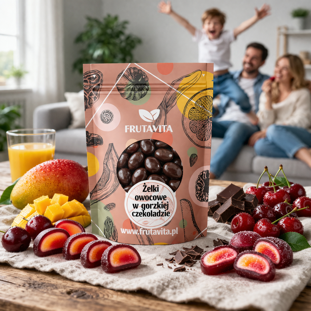Połączenie owocowych żelków i czekolady o min. 54% kakao